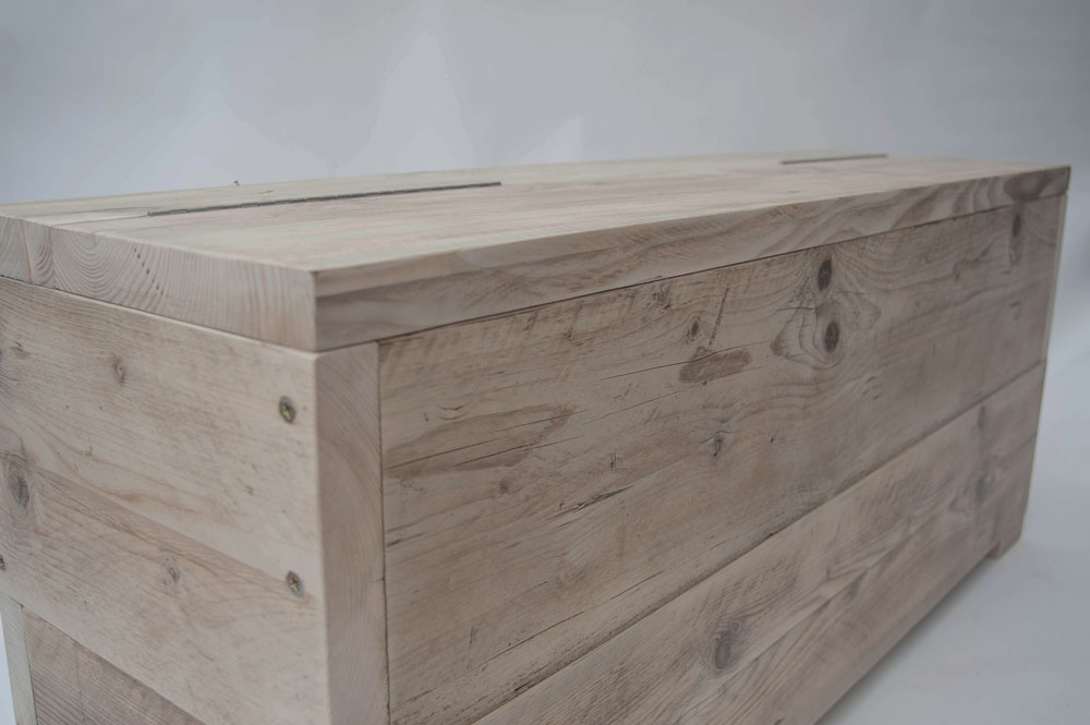 Rustic hallway storage bench. These benches are made using carefully selected reclaimed timber from rustic barns, scaffold boards and demolition sites. Each board is carefully chosen for every product to ensure consistency in look. The pictured Storage bench is made using reclaimed salt weathered scaffold boards.